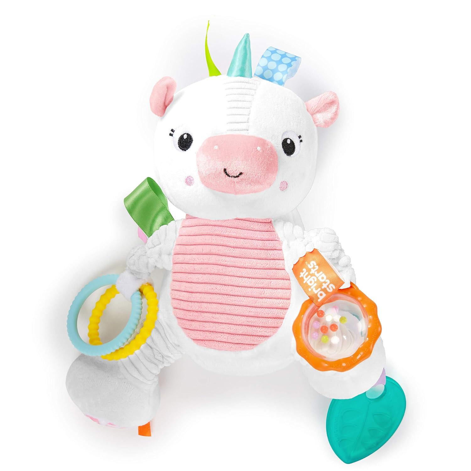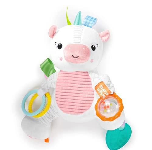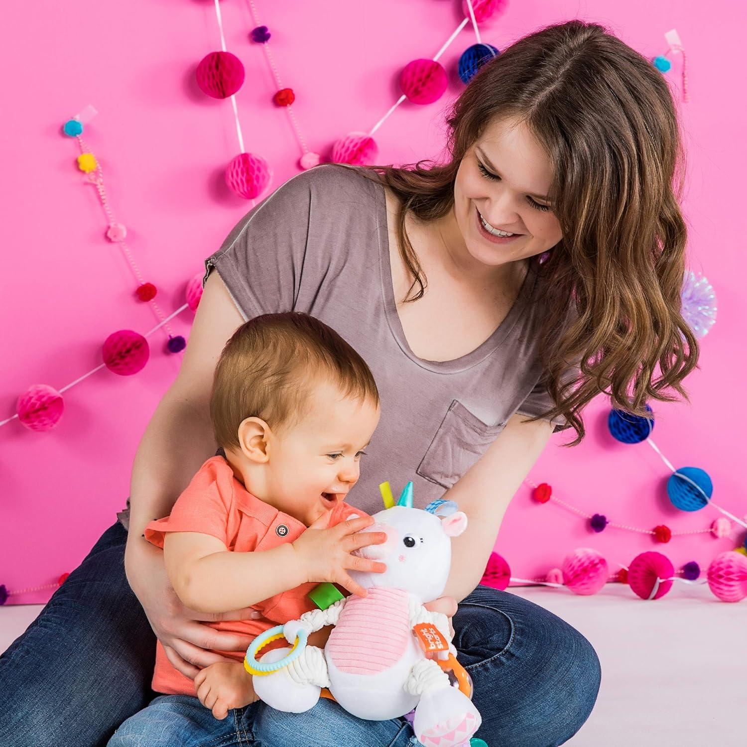 Your baby girl will ride away on an adventure of enchantment with the bunch-o-fun Unicorn toy by Bright Starts. Made for magical memories, This ultra-soft plush toy encourages the development of fine motor skills from hugging and tugging to teething. The Pretty Pony and her Unicorn horn are surrounded by soothing textures and activities that baby can't help but explore. Shake the rattle or clap the clackers to help stimulate her senses. When teething gets tough, this huggable friend will help baby soothe her sore gums using the leaf-shaped teether. With multiple textures and soft pink detailing, this Sweet stuffed animal has the power to soothe baby with just a snuggle.