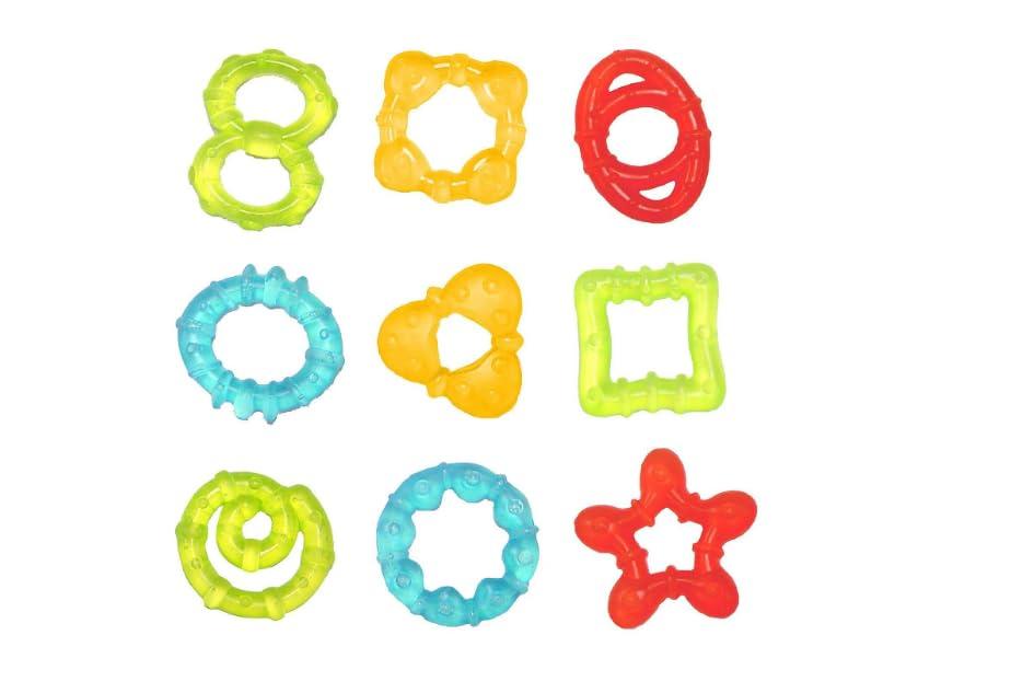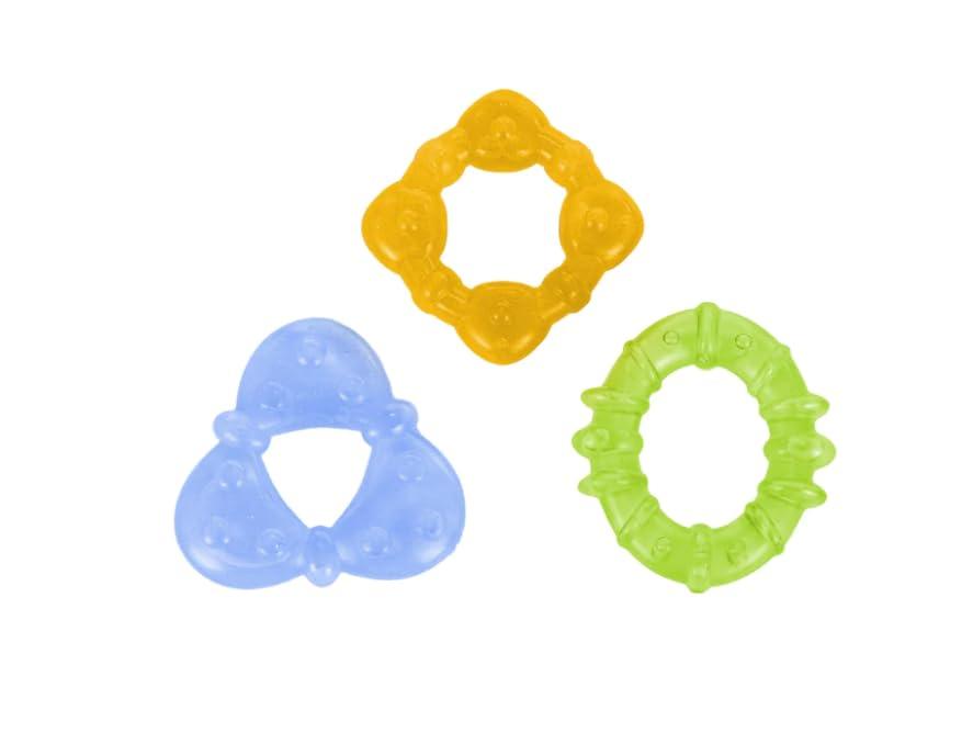 Babies love to chill out with these bright, colorful teethers. Water filled teether that soothes baby's gums, Fun Colors and Textures with easy to grasp shapes for baby, Assortment of 3 per set, Refrigerate for added relief.