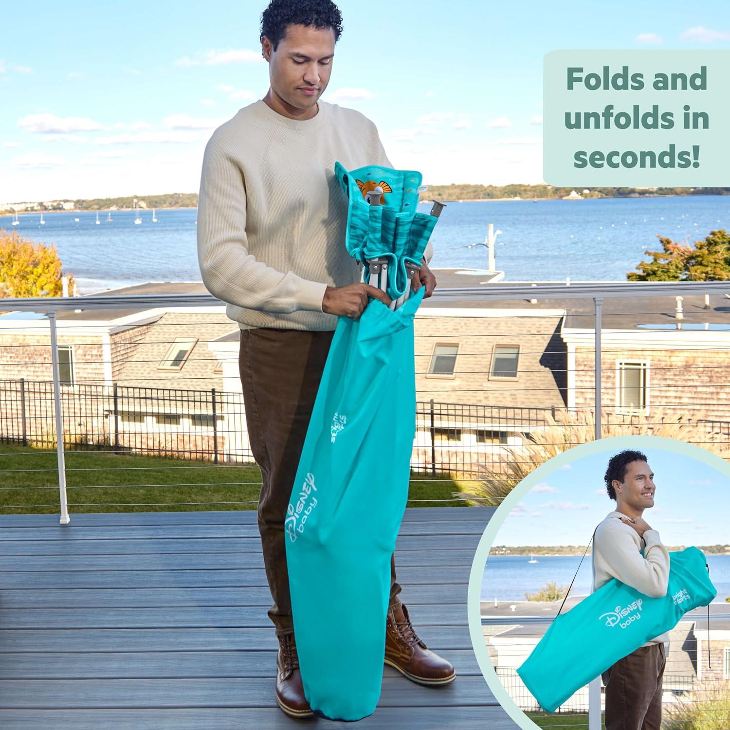 Disney Baby Finding Nemo Pop ‘N Dine portable high chair makes on-the-go mealtime a breeze, from restaurants to the backyard to family travels; made for indoor/outdoor use