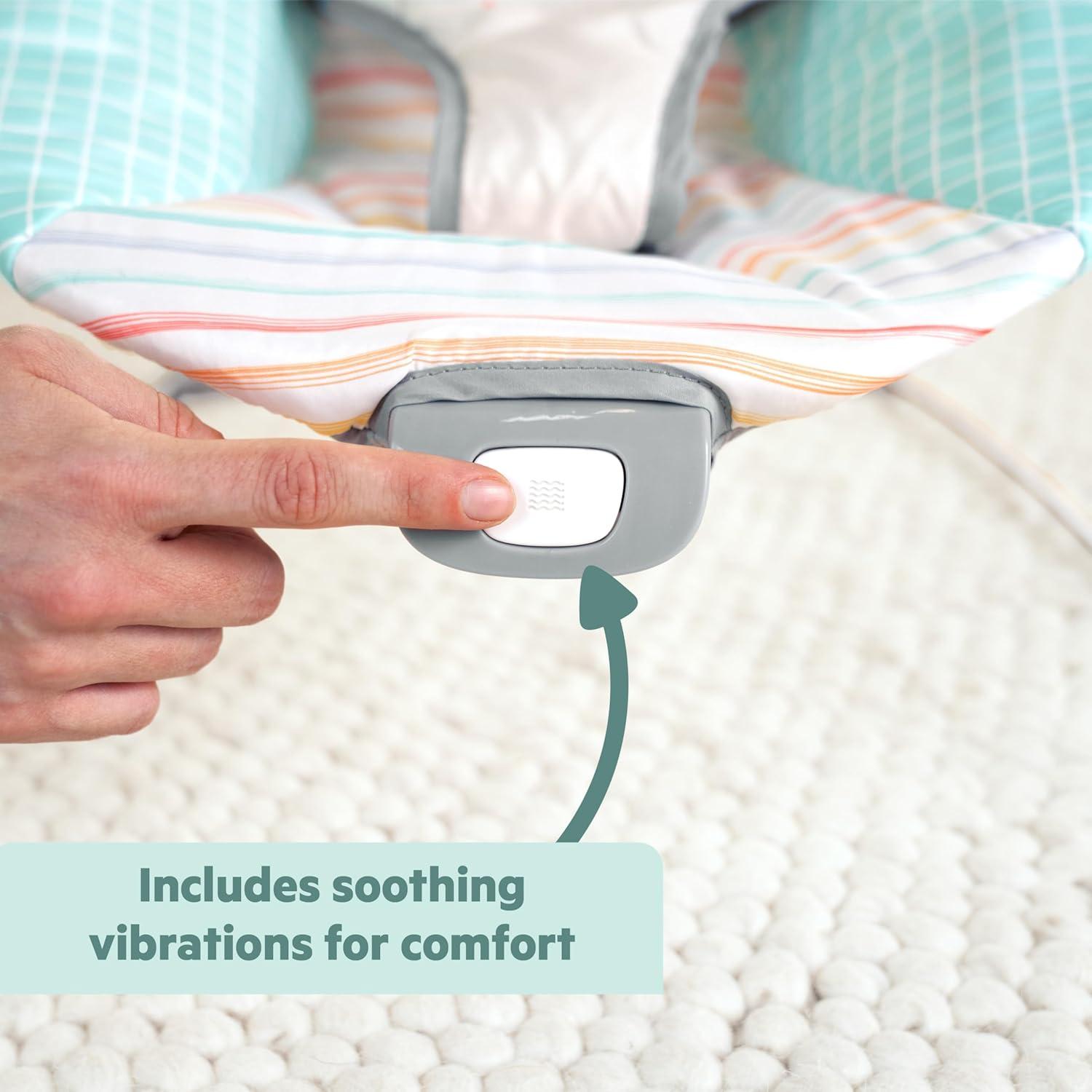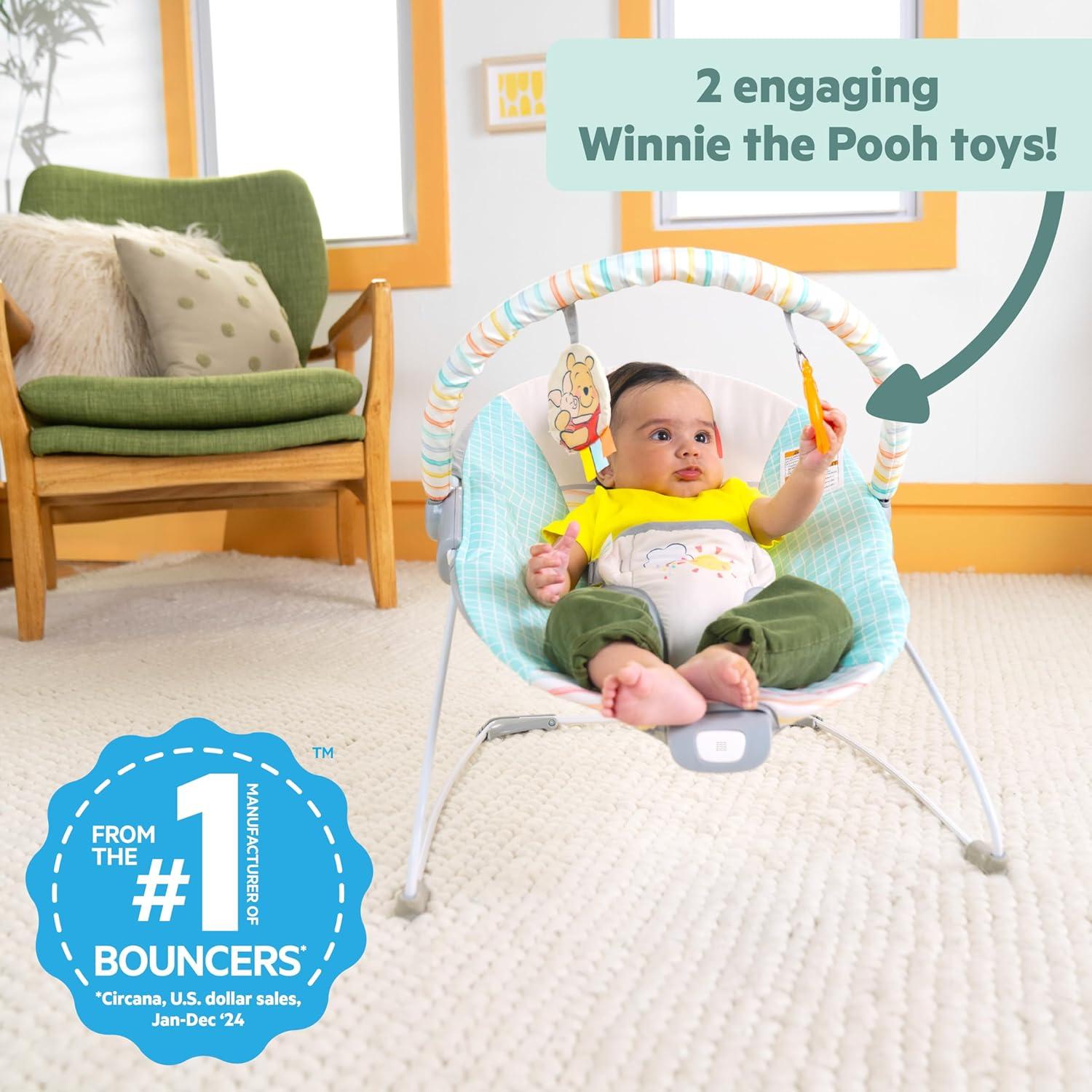 Disney Baby and Bright Starts present the magic of Minnie Mouse’s Spotty Dotty Vibrating Bouncer. This light pink and polka-dotted baby bouncer combines Minnie’s favorite things: fashion and fun! Made with extra-plush fabric and soothing motions, the bouncy seat holds your baby girl like a hug from Minnie herself. Two cute Minnie-themed toys hang above for reaching, grabbing, batting and playing. The non-slip feet and a 3-point harness make sure your little one stays safe and secure. A bit of Minnie’s magic means you can set up this vibrating bouncer with no assembly and remove the toy bar with just one hand!