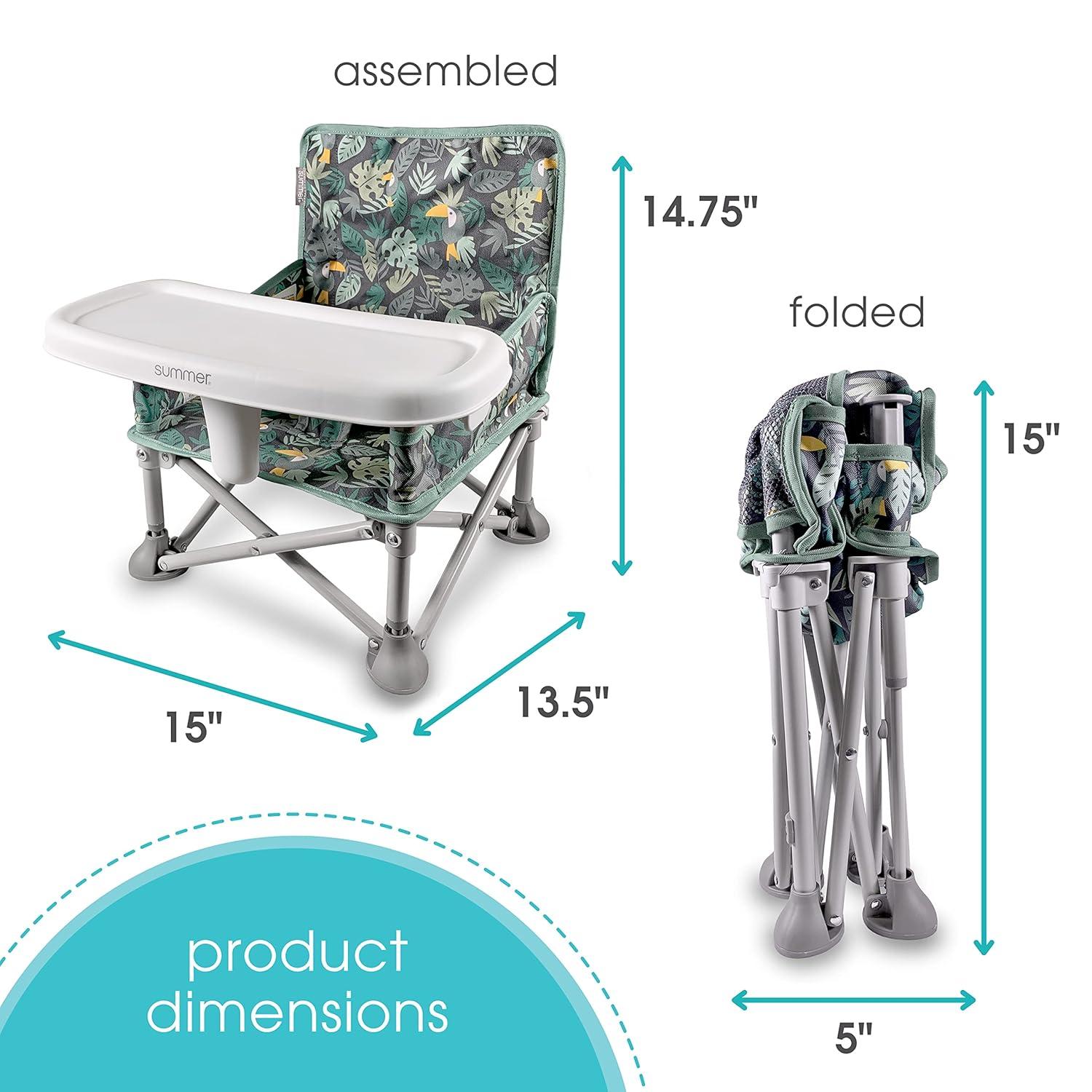 Compact design easily folds to 5 x 15 inches; easy to clean with dishwasher safe tray and machine washable seat pad; includes a rear storage pocket for little essentials