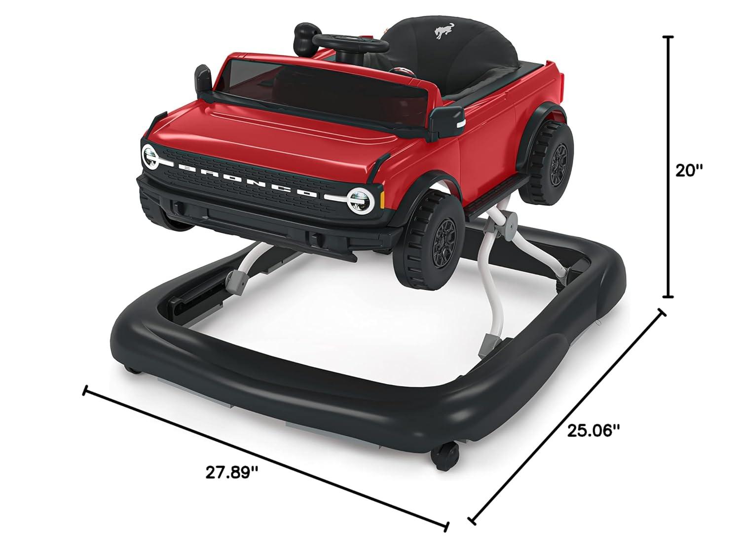 Get ready to explore imagination destinations you’ve never been before with the Bright Starts Ford Bronco Ways to Play Walker! When you need fun in high gear, this Bronco baby walker is the perfect off-roader for the job. The classic Area 51 Blue/Grey 4-in-1 baby walker is built for adventure and is designed to support multiple stages of play, and two can play at once! In baby walker mode, pre-walkers can steer around the house with extra stability and support. More experienced walkers can use as a baby push walker to “hit the road” inside your home. The authentic Bronco sounds, lights, gear shifter, steering wheel and the look of this rugged baby activity walker will drive your baby’s imagination. Or lift off the Bronco frame for a lighter, more portable basic walker for travel (bonus: two can play at once in basic walker mode and push-behind!). The removable steering wheel activity center can be used for floor play or on-the-go. Grows with baby from 6 months to 2 years old. Walker mode supports babies up to 26 lbs.