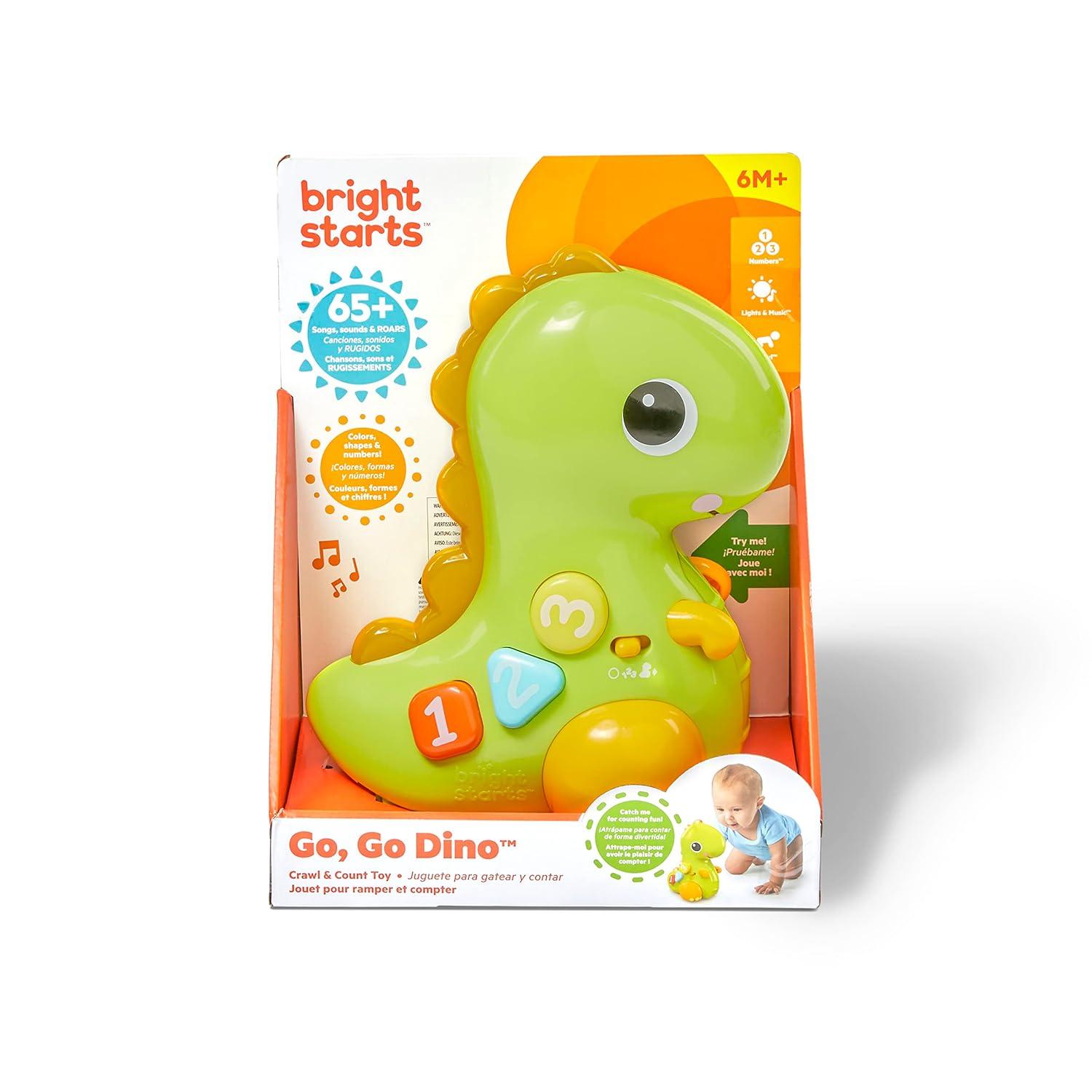 Countdown to a crawling chase in 3, 2, 1…. GO! The Go, Go Dino musical light-up dinosaur toy from Bright Starts rolls around to encourage baby to get movin’. When you’ve caught up to this dinosaur toy, discover numbers, colors and shapes with easy to push buttons. Just a tap of the nose will activate music, lights, motion and silly sounds. Get ready to T-Rex & ROLL!
