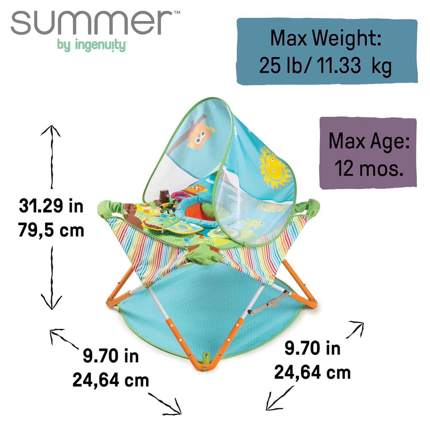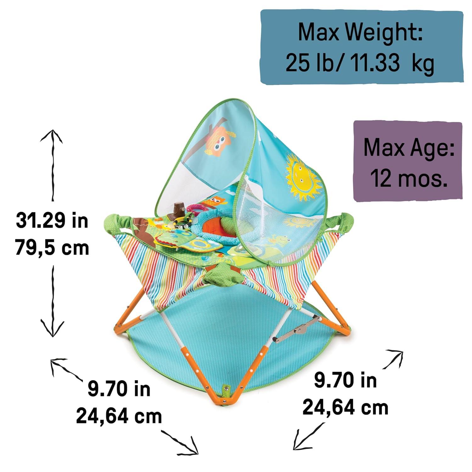 Includes removable canopy that helps protect baby from UV rays while playing outside and storage bag with strap; jumper for baby assembles and folds back up in seconds