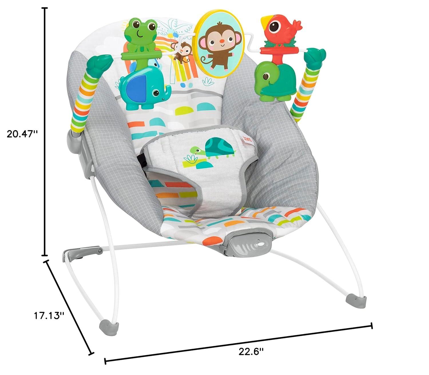 Turn your living room into a paradise of playtime with the Playful Paradise Vibrating Baby Bouncer from Bright Starts. This bouncy seat helps your curious kiddo play and practice motor skills. The silly monkey and friends will spin up sweet smiles as baby reaches to bat and spin the tropical toys hanging from above. Peek-a-boo… I spy a baby-safe mirror on the other side of the spinning monkey! Introduce baby to their own reflection with this surprise & delight toy. A deep comfortable seat, non-slip feet and a 3-point harness make this baby bouncer a safe spot for playtime. That means you have more hands-free moments with baby securely seated in view. Help keep baby calm and content with the bouncy seat’s soothing vibrations. Easily remove the toy bar with one hand when you need to scoop up your baby after playtime. When you're on the move, simply lift on each side when baby is not in the bouncer to move from room to room.