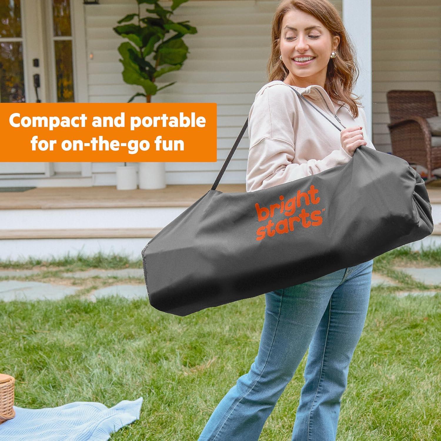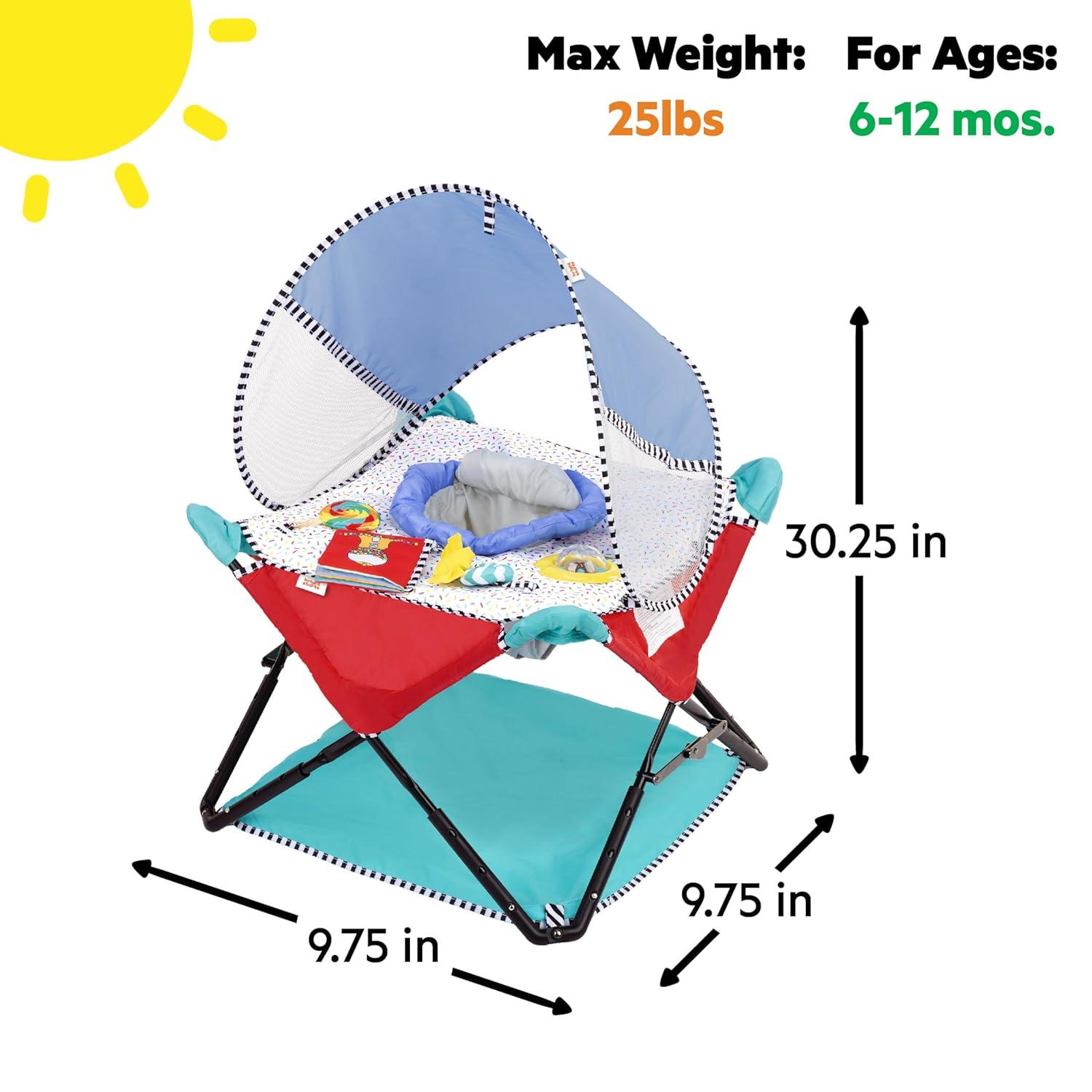 Playtime just got even sweeter. With the Bright Starts Pop ‘N Jump Sweet Treats, baby can jump into a land of sweet treats and big giggles – indoors and out. From the manufacturer of activity jumpers, this compact portable jumper sets up in seconds for both indoor and outdoor fun. The removable canopy provides shade on sunny days and helps protect baby from UV rays (UPF 50+ protection). Easily take this lightweight jumper on the go as a safe place for baby to play in the park, at grandparents’ house, the backyard, and more. Built to grow with baby, 3 height adjustments mean you’ll only need one jumper as they develop. Your little sweetie will love the included dessert-themed sensory toys designed to entertain and encourage fine motor skills: spinner ball, rattle, texture toy and mirror book. When playtime is over, simply fold the jumper back up and store in the included carrying bag. For ages 6 – 12 months or up to 25 lbs. Easy to clean with wipeable toys and machine-washable fabric. Circana, Retail Tracking Service, U.S., Activity Seats/Jumpers excluding No Jumping, dollar sales, 12 months ending October 2023).
