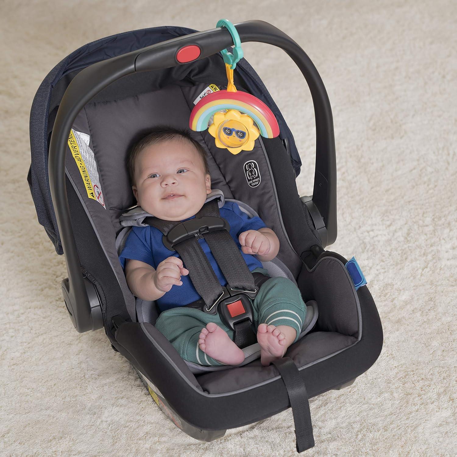 Catch your baby's eye and keep her attention with the sun shaker from Bright Starts! You'll delight your infant with cause-and-effect surprises like the light-up Rainbow and cheerful tunes. Baby can control the fun by activating lights and music with just a shake. Encourage fine motor skills with the spinning sunshine, which shows a different face on each side! Give it a spin to see the sun wearing radically cool sunglasses. This take-along toy is made for fun on the go with a go-anywhere link that attaches to most carriers and strollers.