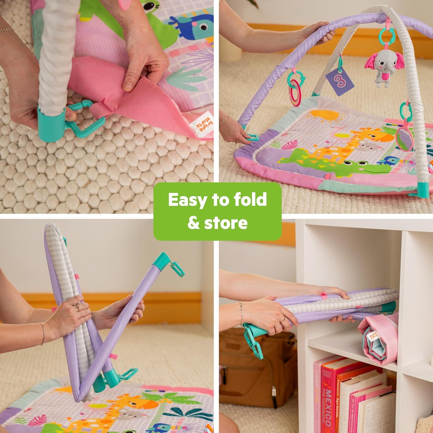 Make playtime a sweet safari of activity with the Wild Wiggles Activity Gym from Bright Starts. Your king or queen of the jungle will love to kick, lay and play on this tummy time mat! With a new, space-saving FoldAway toy bar and 5 toys included, there’s so much fun in one compact space. Includes plush musical elephant toy, tummy time mirror, sun rattle, leaf toy, and ring rattle. The elephant pal plays 4 melodies to entertain your infant. The tummy time toys all come on removable links, so you can transform your play mat toys into stroller toys! This play gym for baby is filled with bright colorful animal characters, featuring an elephant, monkey and lion. Capture your baby’s attention with 10 Taggies and encourage the development of motor skills with every activity. The toy bar easily removes as your wild child begins to grow and roam around this jungle gym.