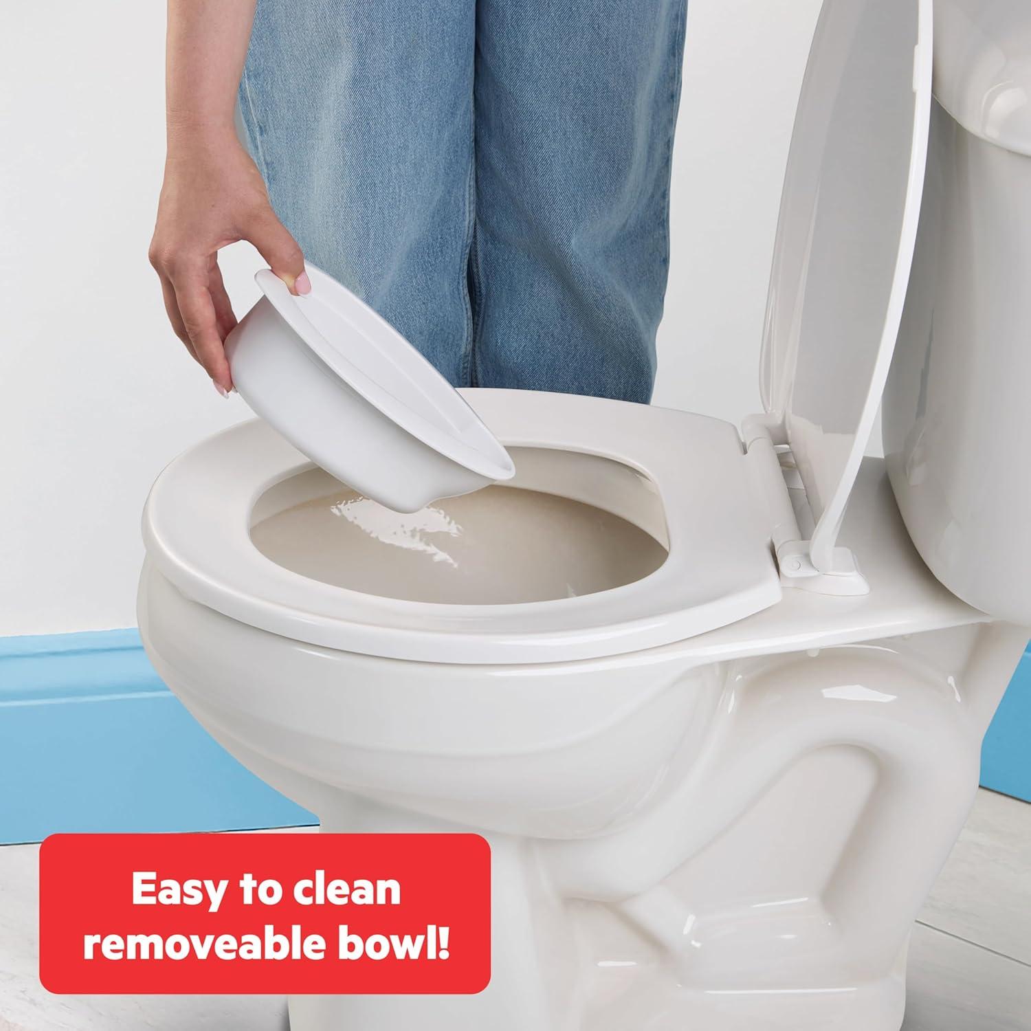 Removable pot makes clean-up a breeze; removable toddler toilet seat fits most round, elongated, and D-shape toilets; built-in splash guard and handles